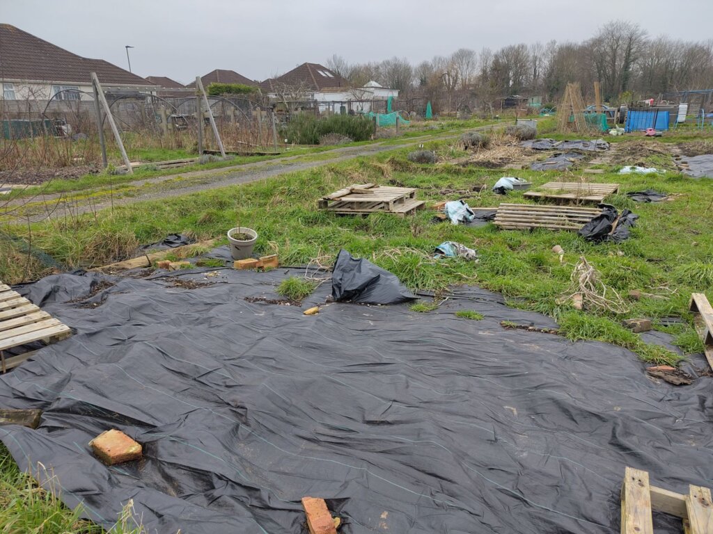Once we had done this, we covered over as much of the plot as possible using some plastic that was already on the plot, although a bit scrunched over.