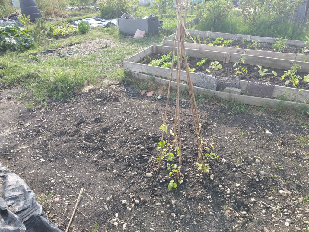 I got some bamboo poles that we had cut down from our own garden and used those as supports for the tomatoes and beans.