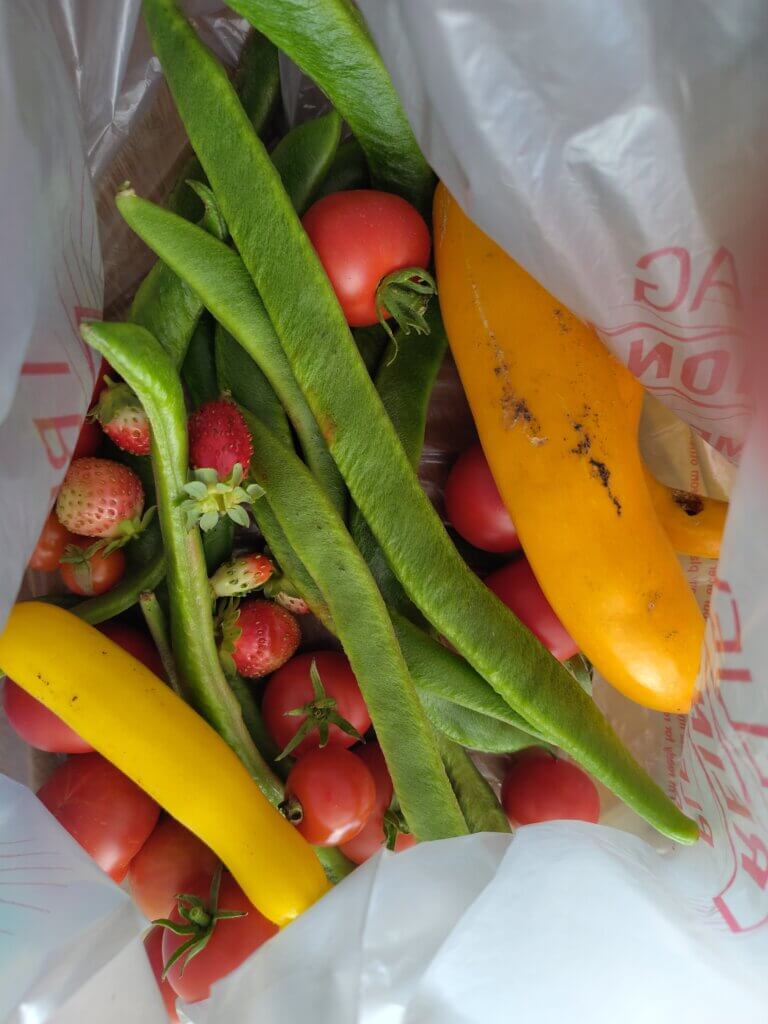 In July, August and September, the fruit and vegetables were growing and ripening, ready for harvest. It was a challenge keeping on top of it all. The plants that yielded the most were the runner beans and tomatoes, where they were ripening faster than we could pick and eat them!